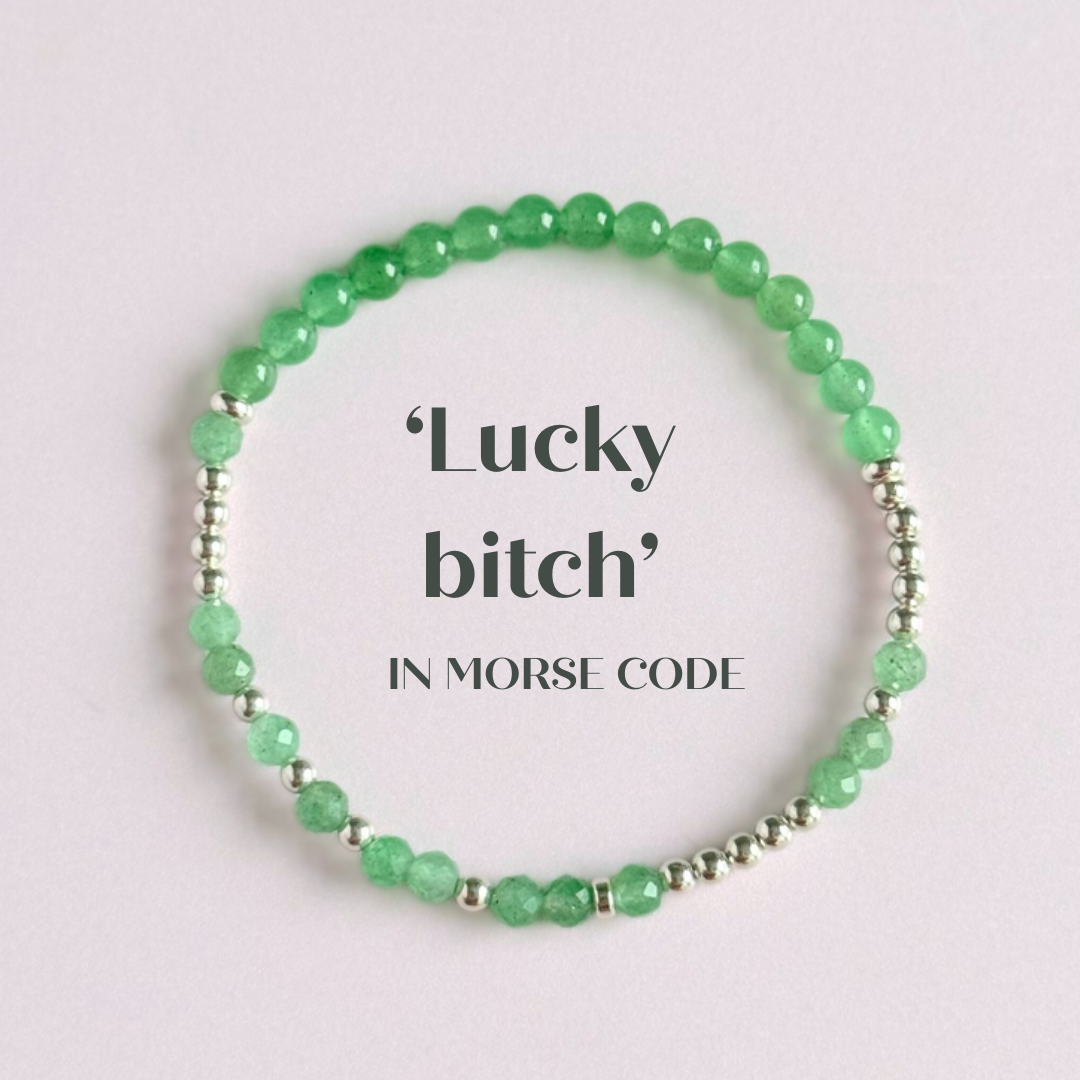 ‘Lucky bitch’ green aventurine crystal morse code bracelet for abundance and manifestation