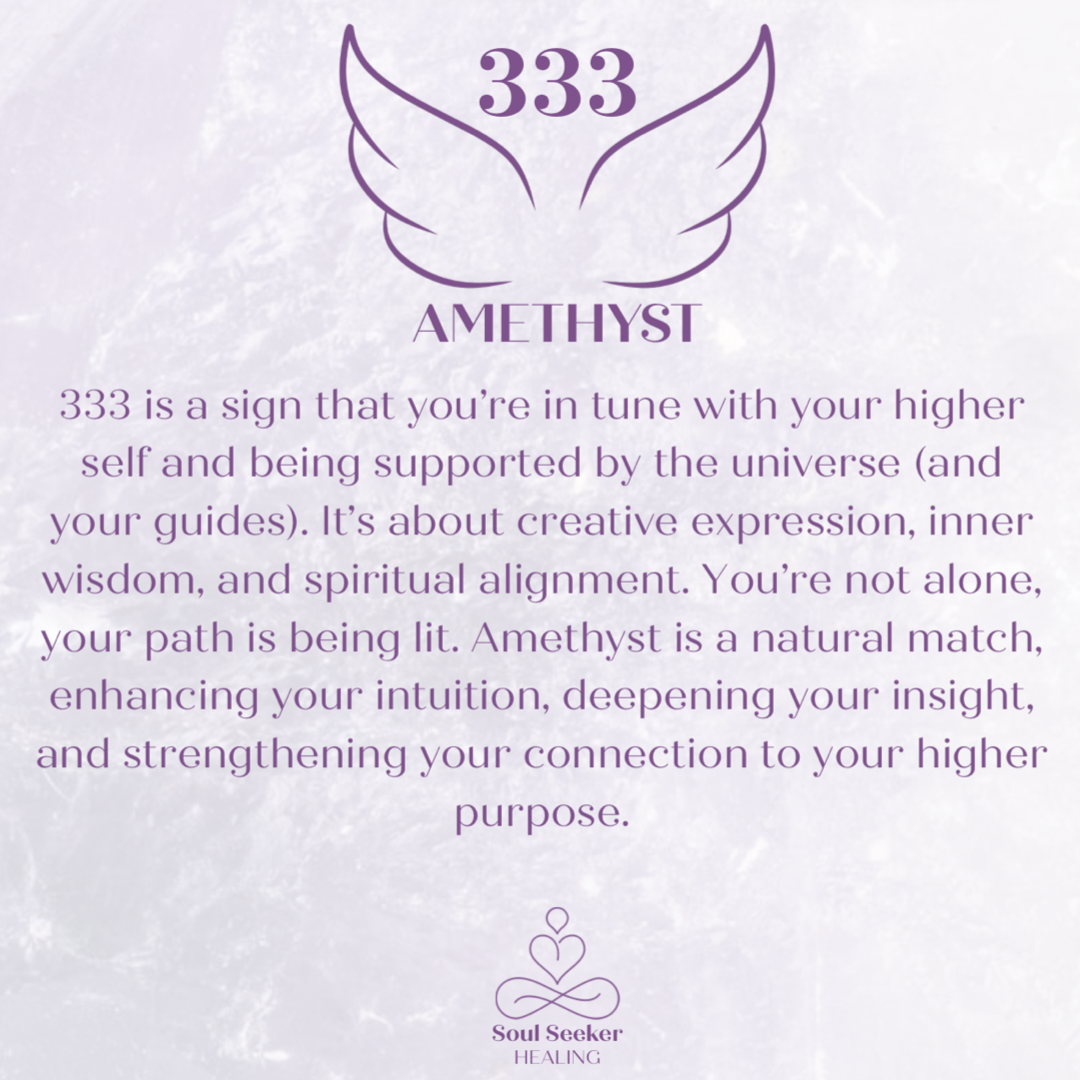333 is a sign that you’re in tune with your higher self and being supported by the universe (and your guides). It’s about creative expression, inner wisdom, and spiritual alignment. You’re not alone, your path is being lit. Amethyst is a natural match, enhancing your intuition, deepening your insight, and strengthening your connection to your higher purpose.