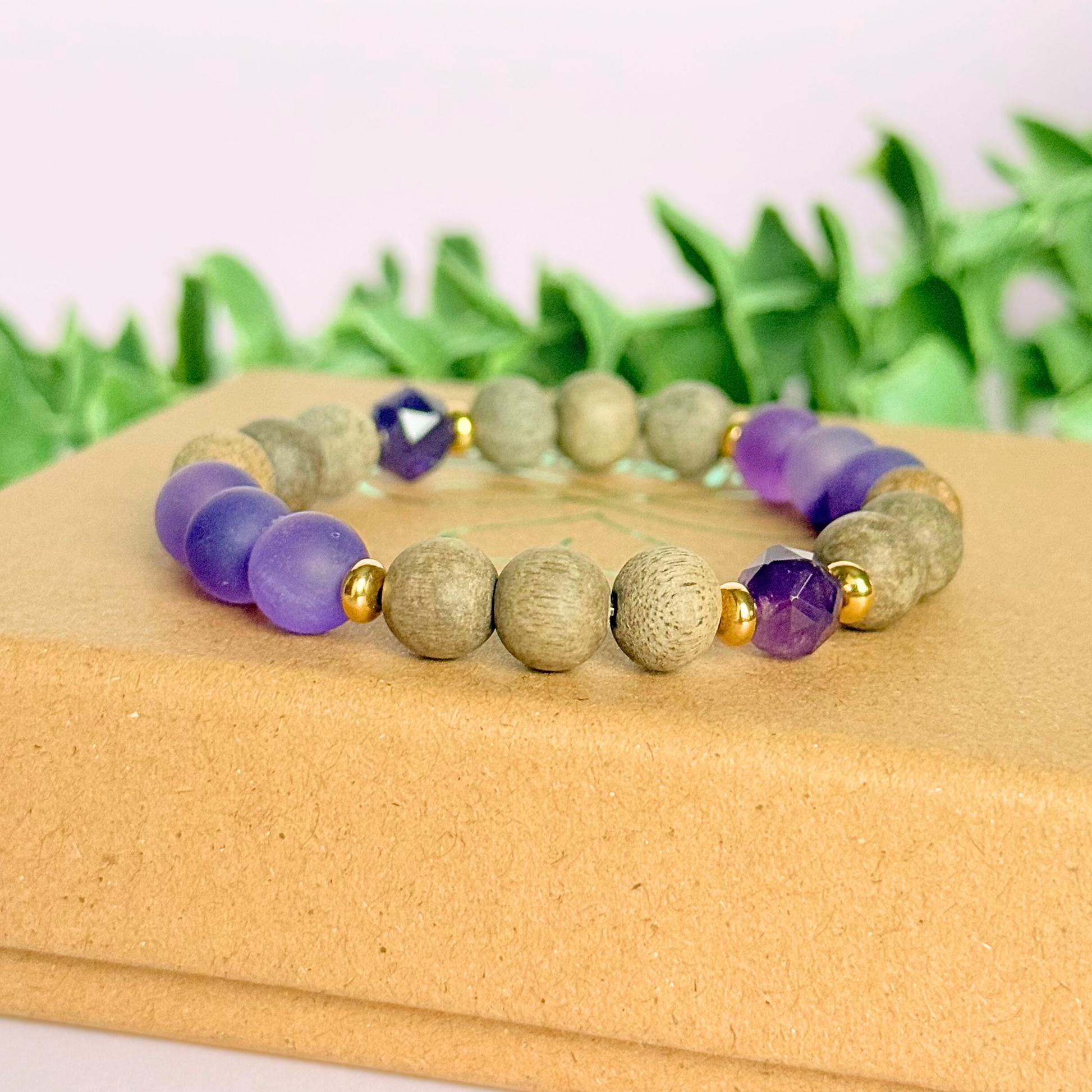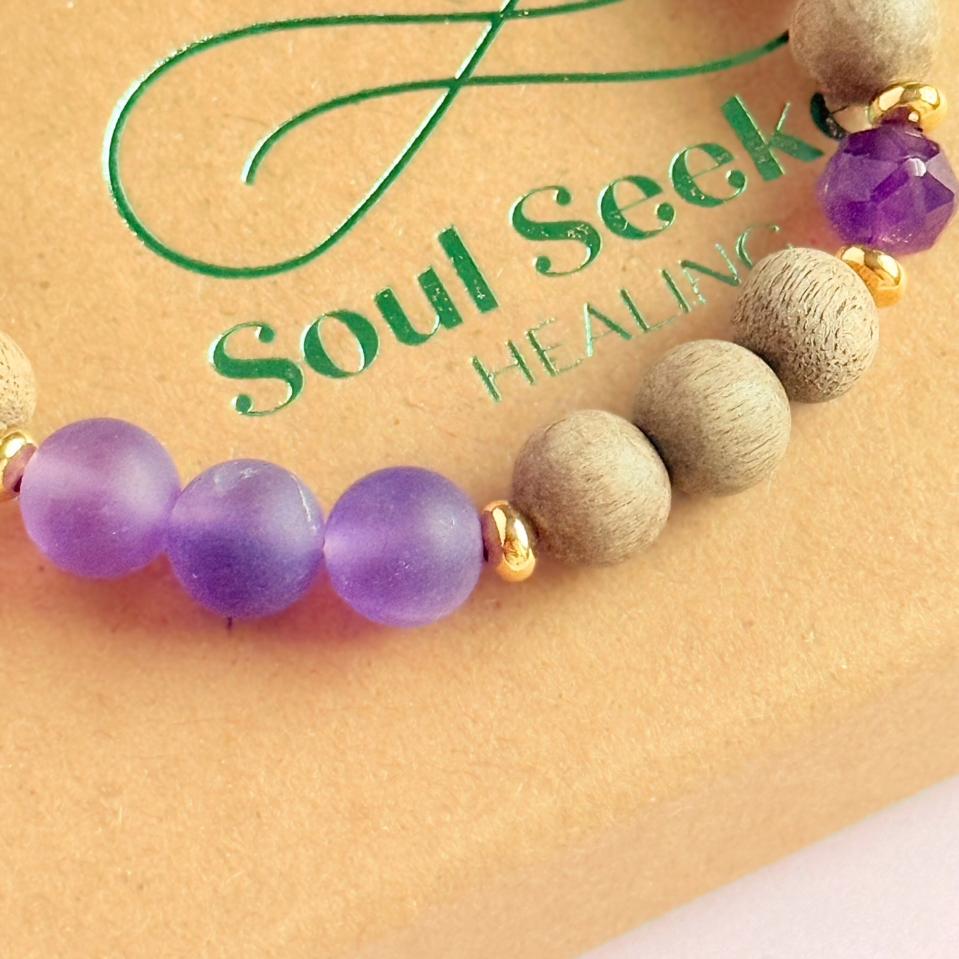 This amethyst essential oil bracelet features 8mm frosted amethyst beads and star cut amethyst crystal beads, with raw greywood beads to diffuse essential oils. Choose from gold vermeil, rose gold vermeil or sterling silver accent beads.