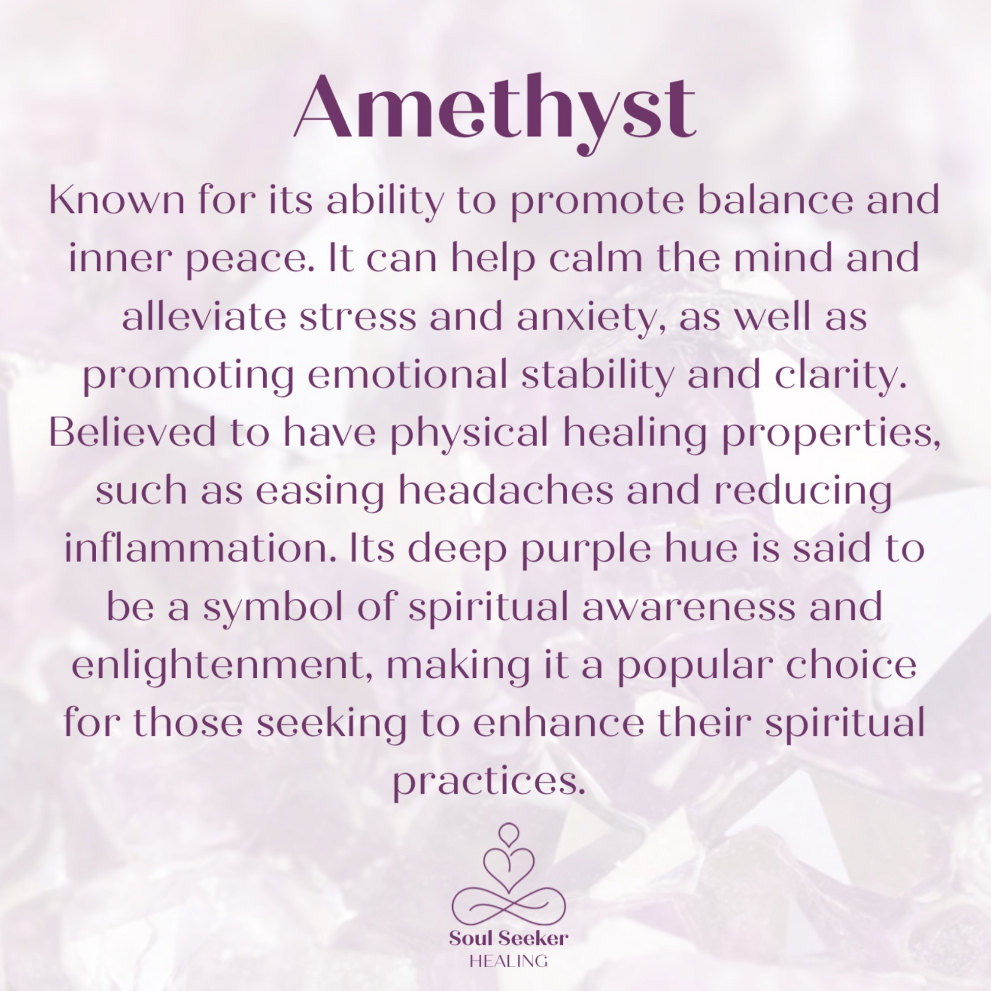 Amethyst is known for its ability to promote balance and inner peace. It can help calm the mind and alleviate stress and anxiety, as well as promoting emotional stability and clarity. Believed to have physical healing properties such as easing headaches and reducing inflammation. Its deep purple hue is said to be a symbol of spiritual awareness and enlightenment, making it a popular choice for those seeking to enhance their spiritual practices.