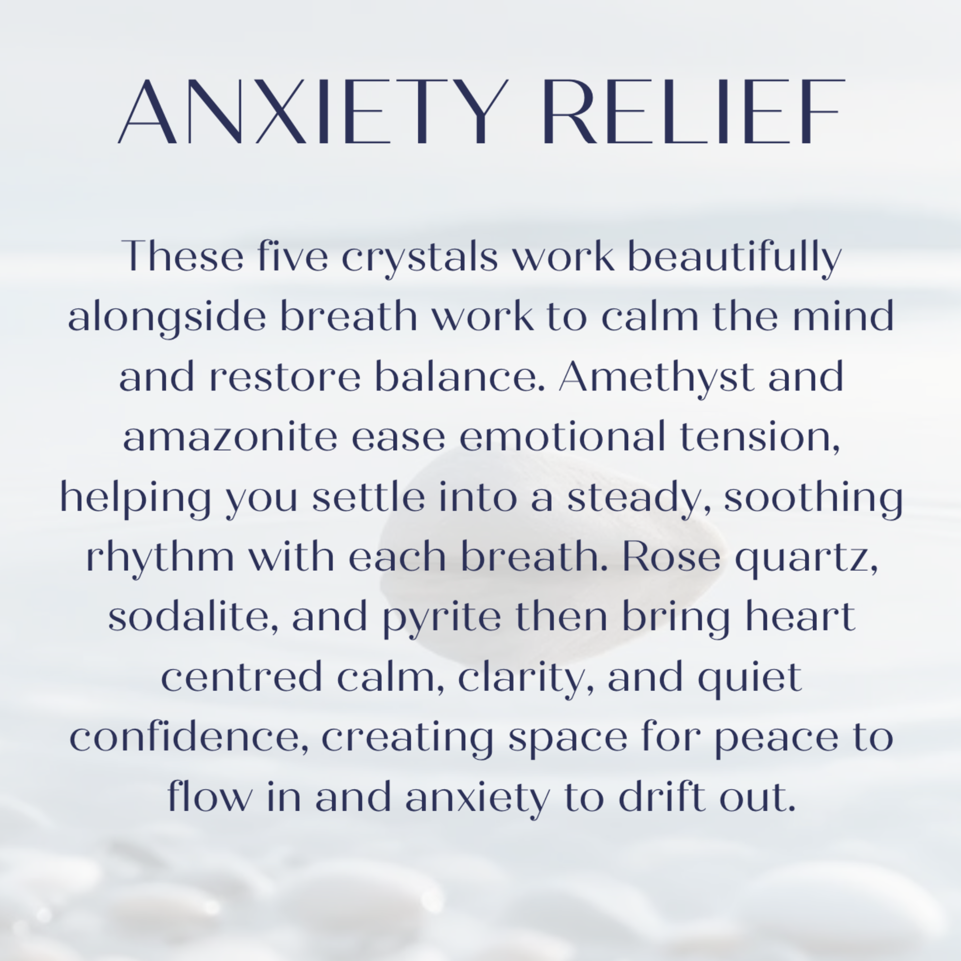 These five crystals work beautifully alongside breath work to calm the mind and restore balance. Amethyst and amazonite ease emotional tension, helping you settle into a steady, soothing rhythm with each breath. Rose quartz, sodalite, and pyrite then bring heart centred calm, clarity, and quiet confidence, creating space for peace to flow in and anxiety to drift out.