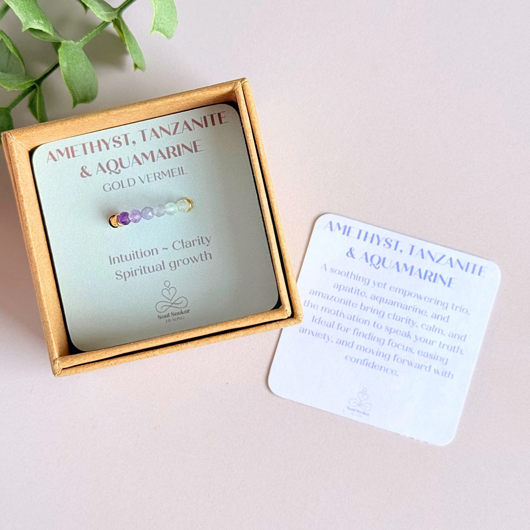 The combination of aquamarine, tanzanite, and amethyst brings a soothing energy that calms the mind and supports emotional clarity. Together, they enhance spiritual insight, strengthen intuition, and encourage peaceful self-expression.