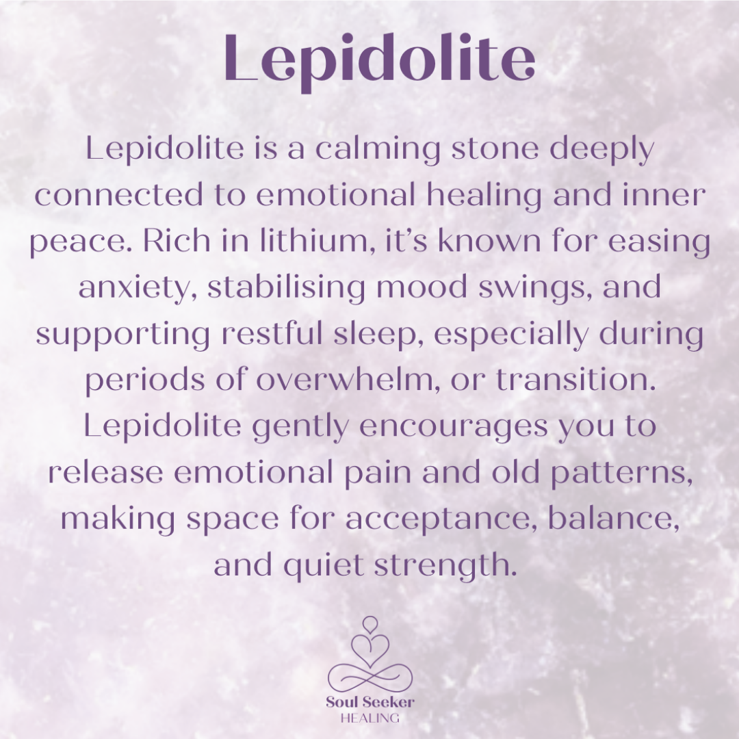 Lepidolite is a calming stone deeply connected to emotional healing and inner peace. Rich in lithium, it’s known for easing anxiety, stabilising mood swings, and supporting restful sleep, especially during periods of overwhelm, or transition. Lepidolite gently encourages you to release emotional pain and old patterns, making space for acceptance, balance, and quiet strength.