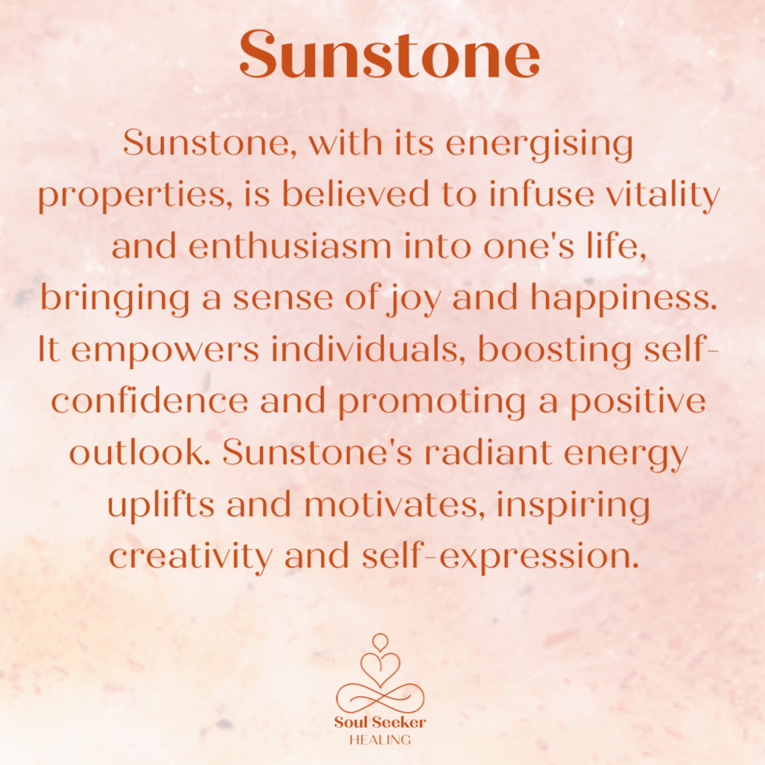 Sunstone, with its energising properties, is believed to infuse vitality and enthusiasm into one's life, bringing a sense of joy and happiness. It empowers individuals, boosting self-confidence and promoting a positive outlook. Sunstone's radiant energy uplifts and motivates, inspiring creativity and self-expression.