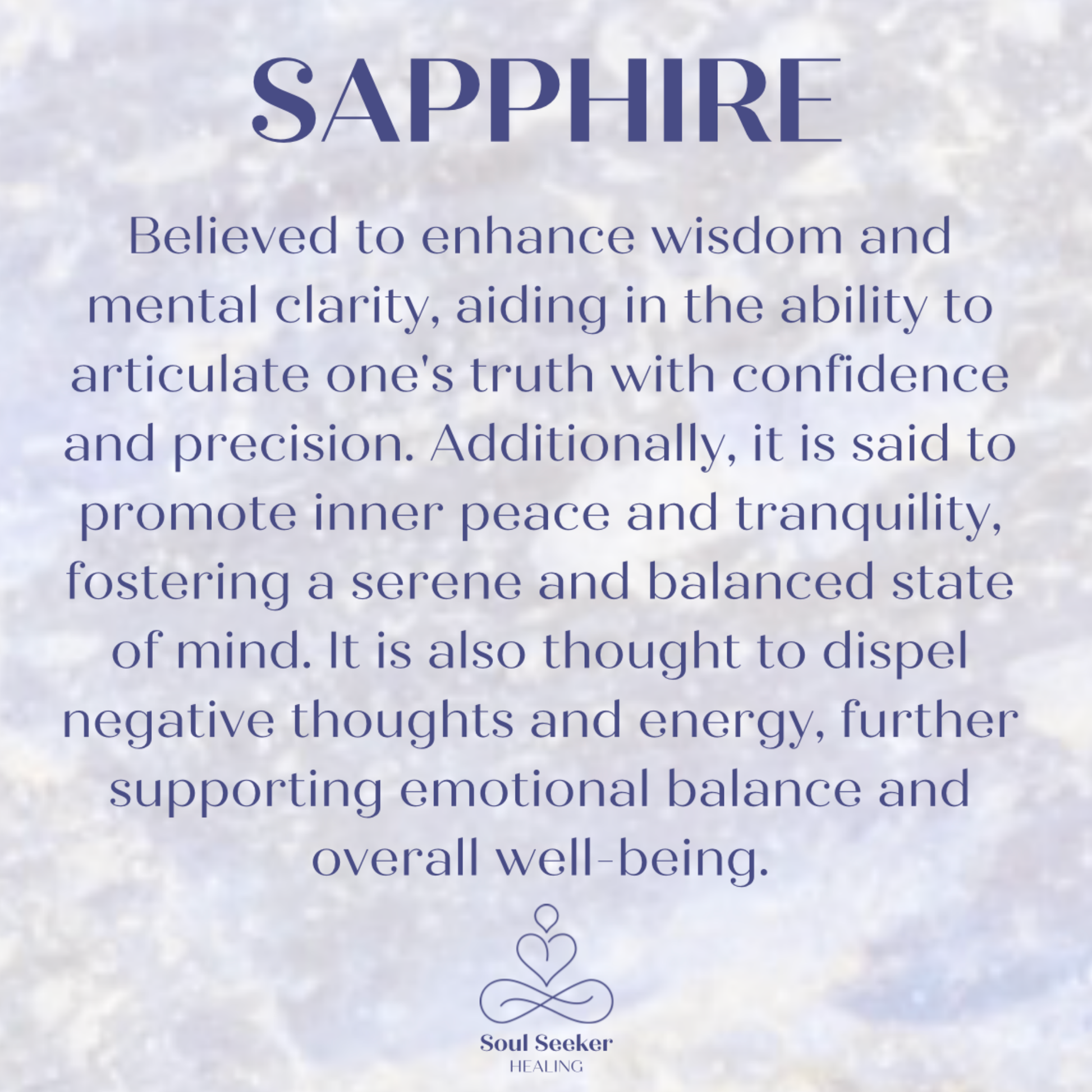 Sapphire is believed to enhance wisdom and mental clarity, aiding in the ability to articulate one's truth with confidence and precision. Additionally, it is said to promote inner peace and tranquility, fostering a serene and balanced state of mind. It is also thought to dispel negative thoughts and energy, further supporting emotional balance and overall well-being.