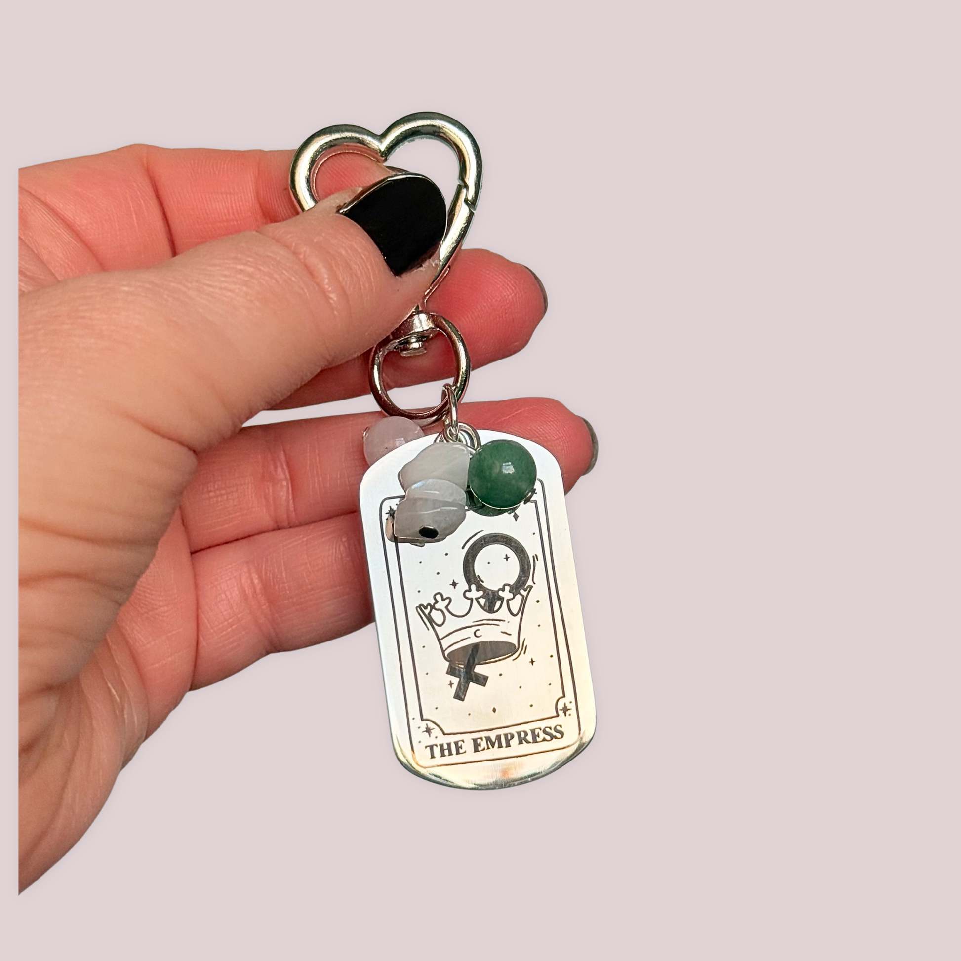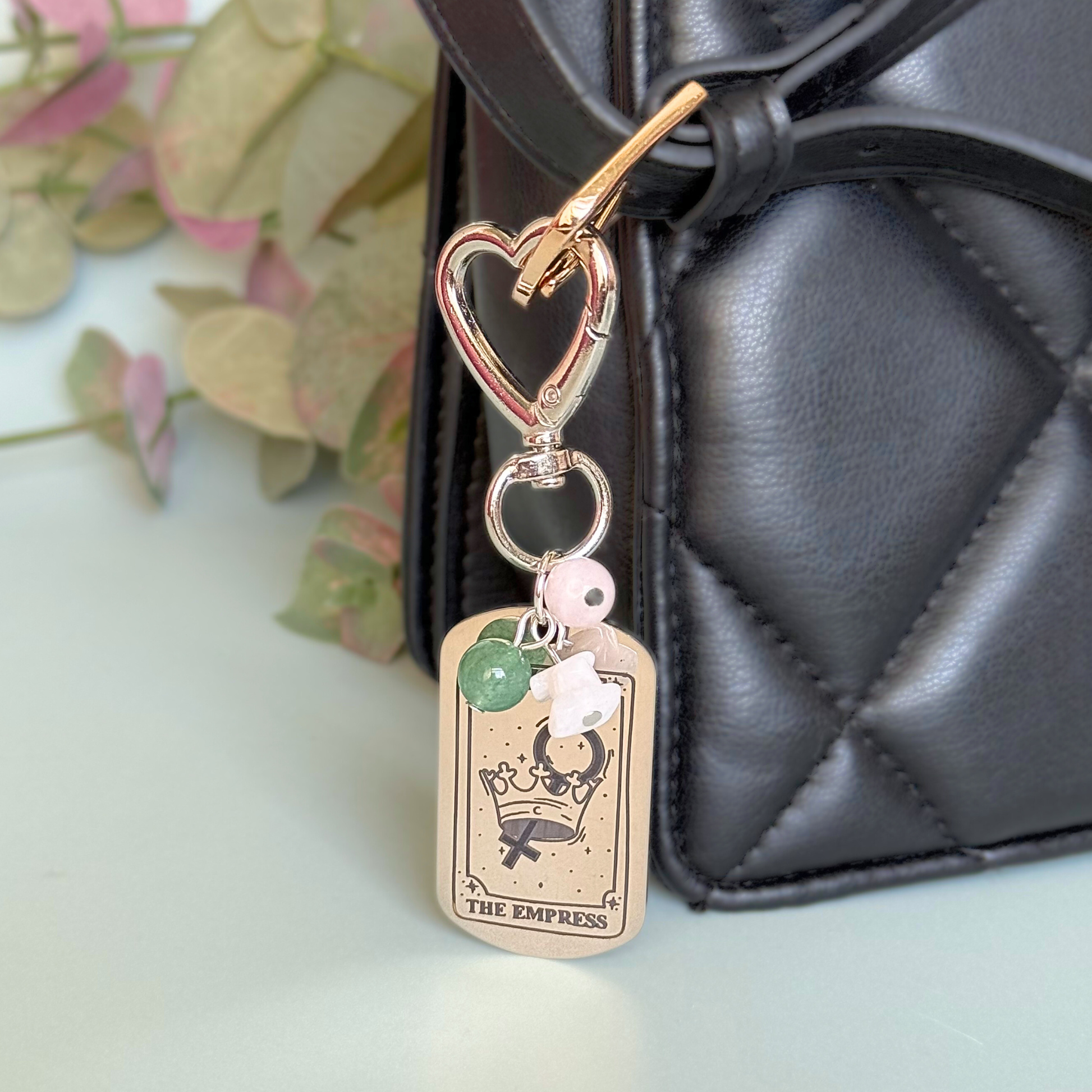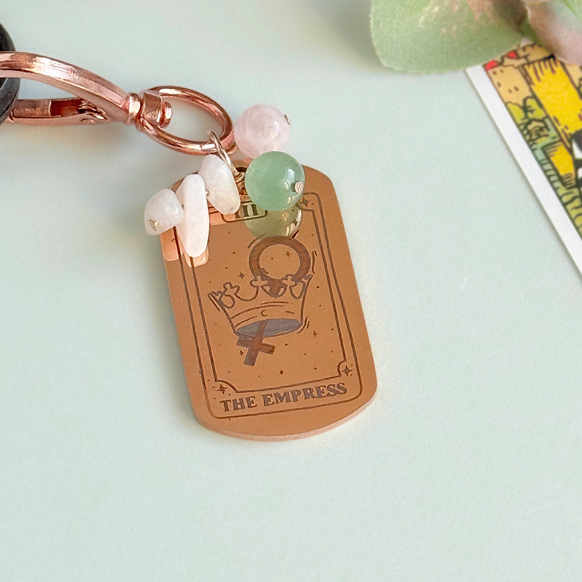 This tarot card inspired keyring features a stainless steel engraved tag with The Empress card on the front and her meaning on the back, offering a gentle daily nudge toward self-love, creativity and emotional wellbeing.