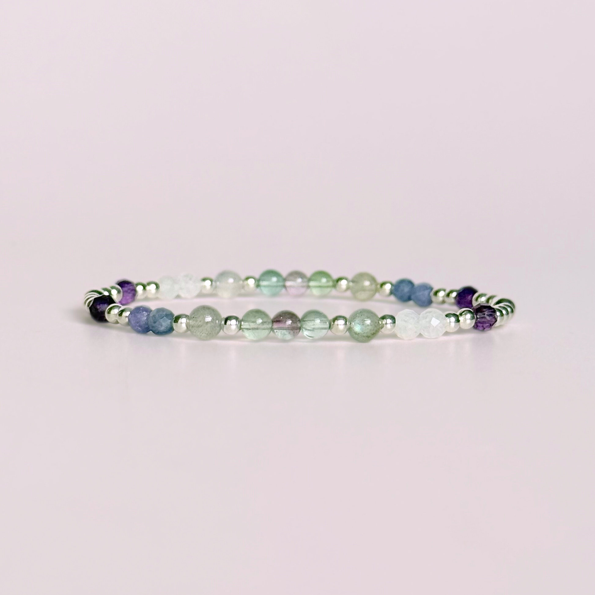 Inspired by nature’s most magical light show, this blend of fluorite, moonstone, labradorite, tanzanite and amethyst captures the calm, mystery and wonder of the aurora. Each stone brings clarity, intuition and inner peace, like carrying a touch of the night sky wherever you go.