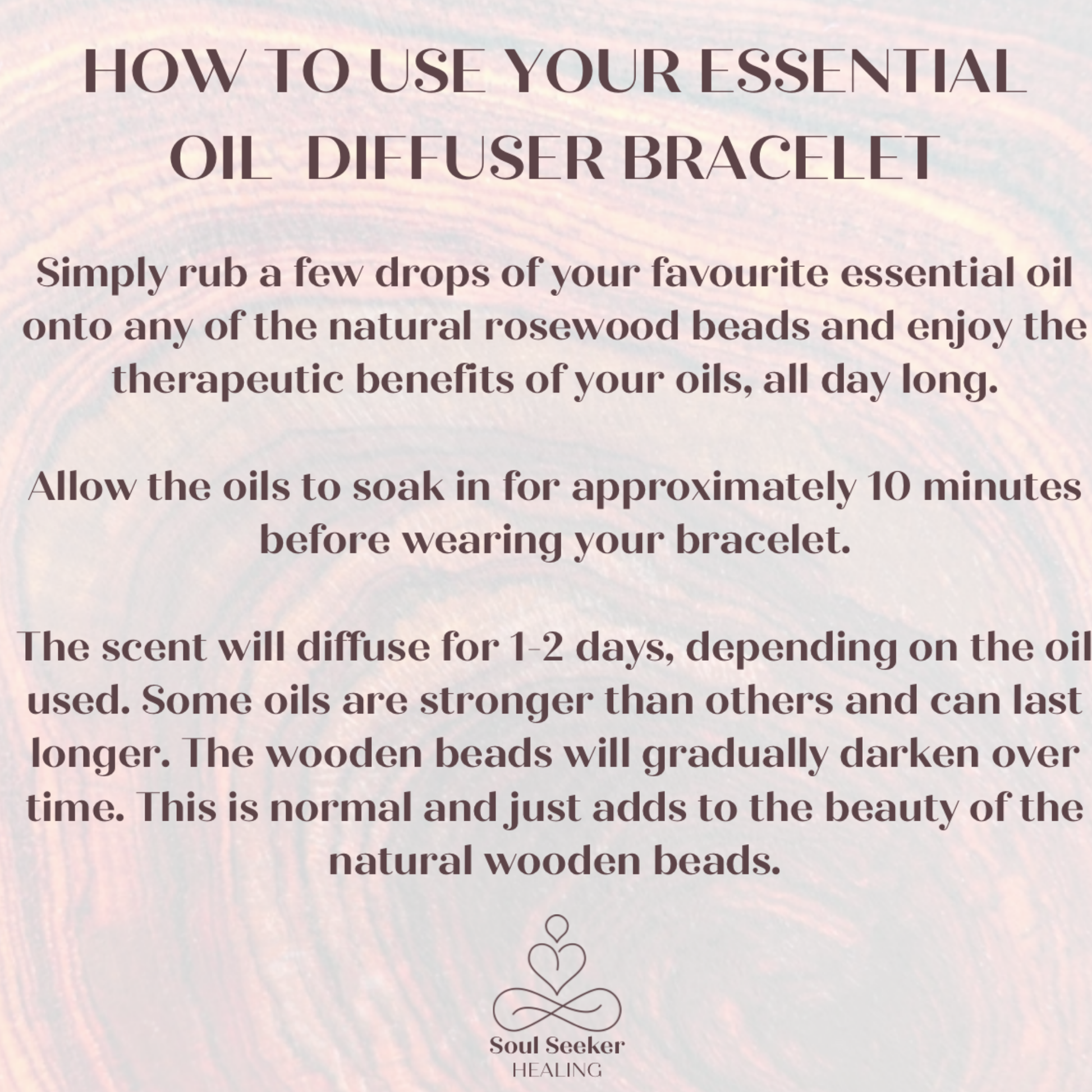 Simply add a few drops of your favourite essential oil to the rosewood beads. As the scent evaporates, simply add a few more drops to keep the aroma going.