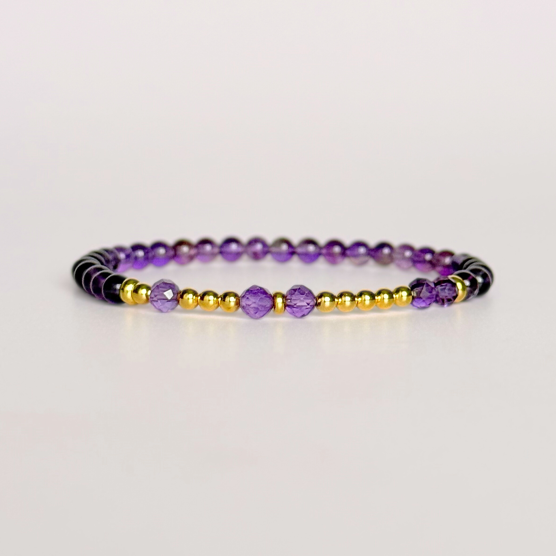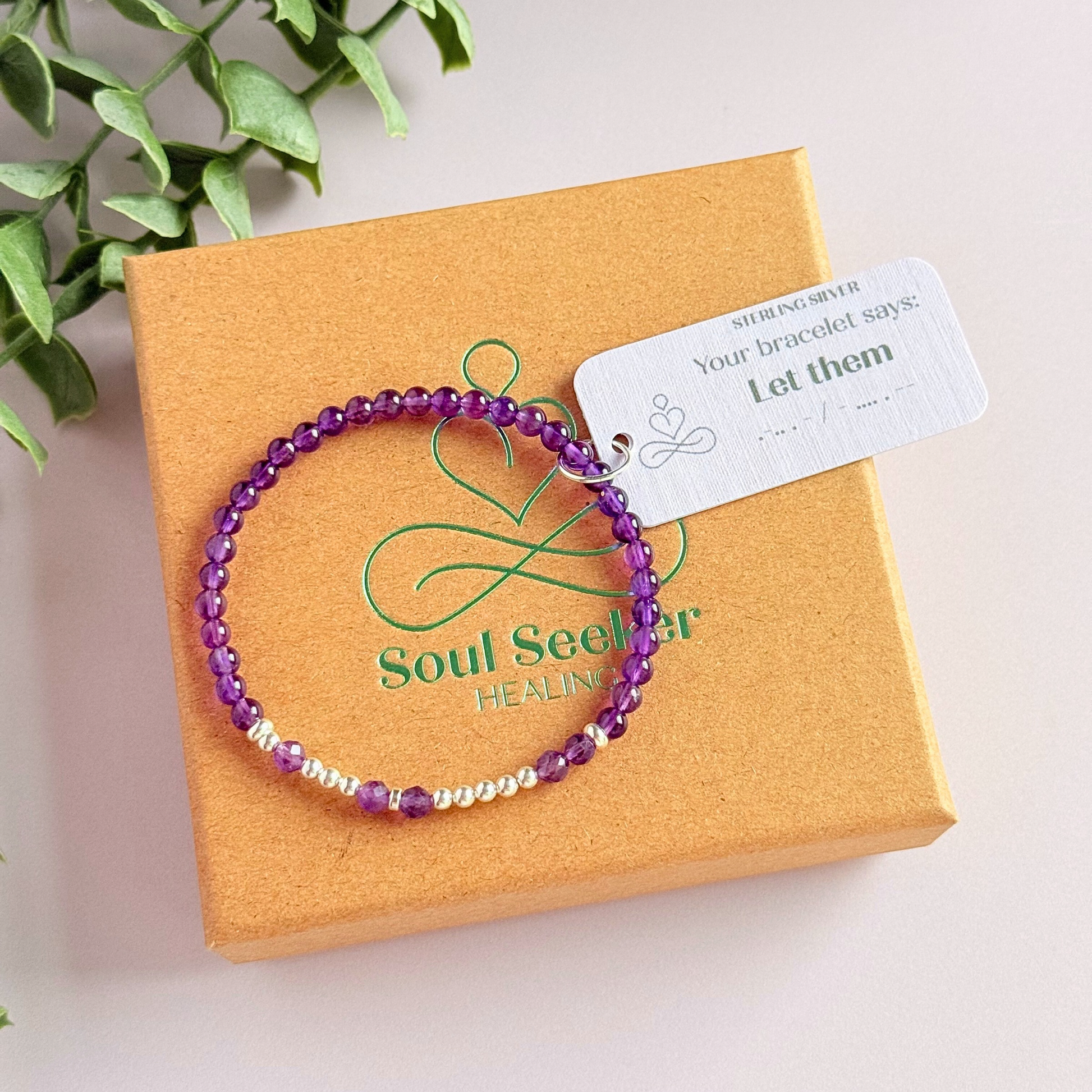 This amethyst crystal morse code bracelet spells out the words ‘Let them’ in a combination of 4mm round amethyst beads, 4mm faceted amethyst beads and either sterling silver or gold vermeil 3mm round beads. The words start and end at the rondelle spacer beads.