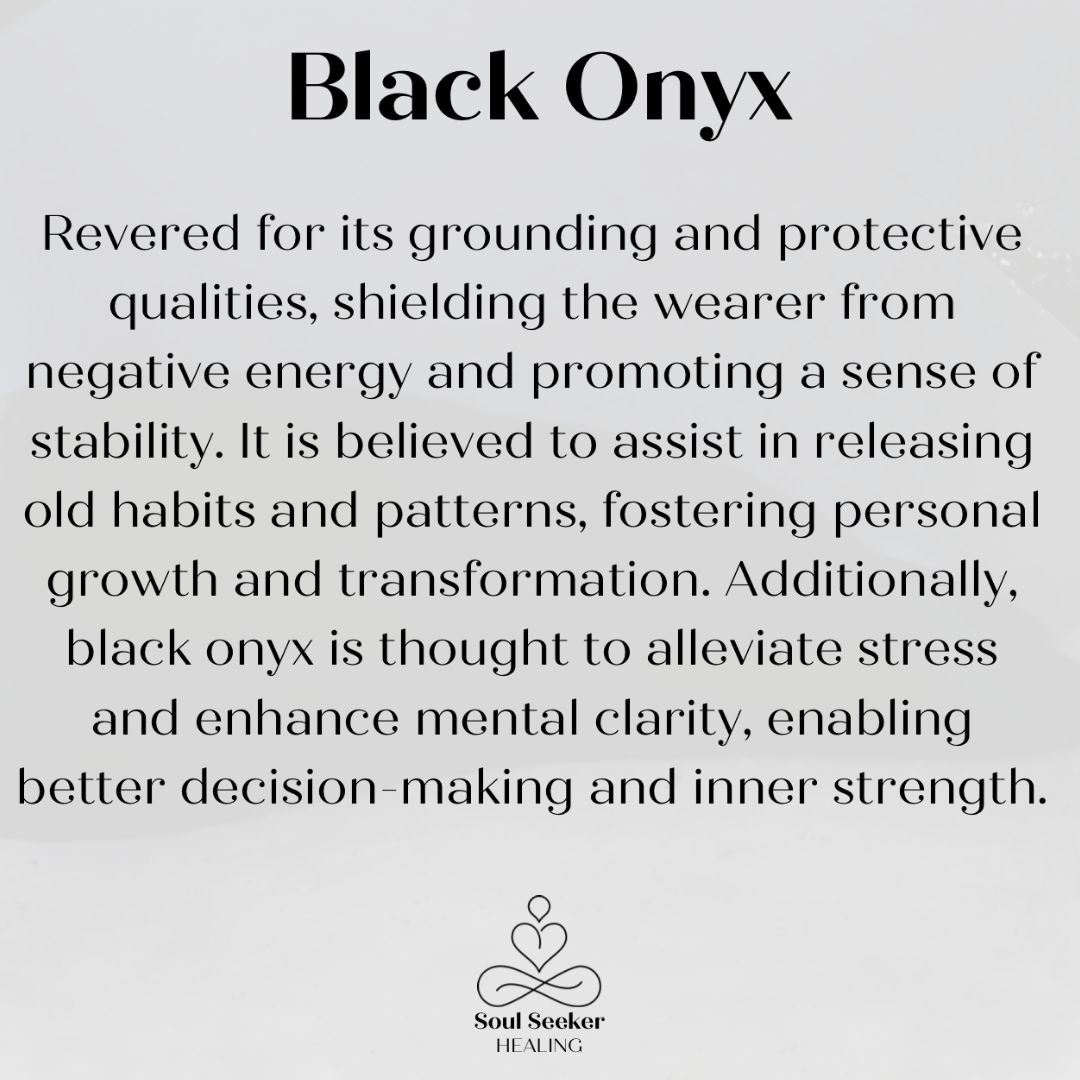 Black onyx is often associated with grounding and protection, providing stability and a sense of security during challenging times. It is believed to absorb negative energies, promoting emotional balance and encouraging inner strength and resilience.