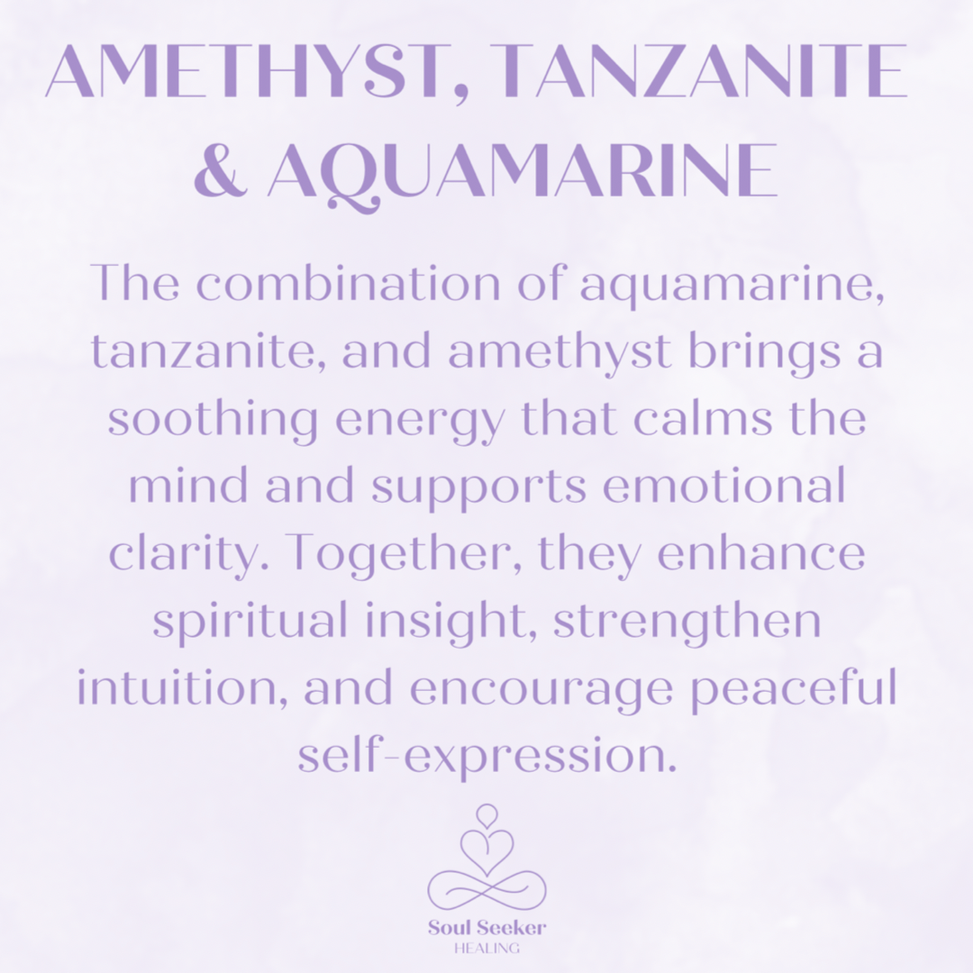 The combination of aquamarine, tanzanite, and amethyst brings a soothing energy that calms the mind and supports emotional clarity. Together, they enhance spiritual insight, strengthen intuition, and encourage peaceful self-expression.