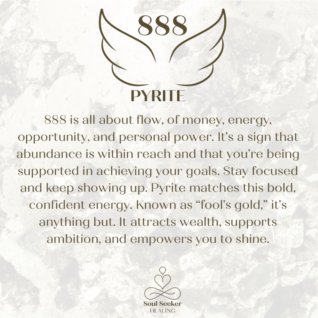 888 is all about flow, of money, energy, opportunity, and personal power. It’s a sign that abundance is within reach and that you’re being supported in achieving your goals. Stay focused and keep showing up. Pyrite matches this bold, confident energy. Known as “fool’s gold,” it’s anything but. It attracts wealth, supports ambition, and empowers you to shine.