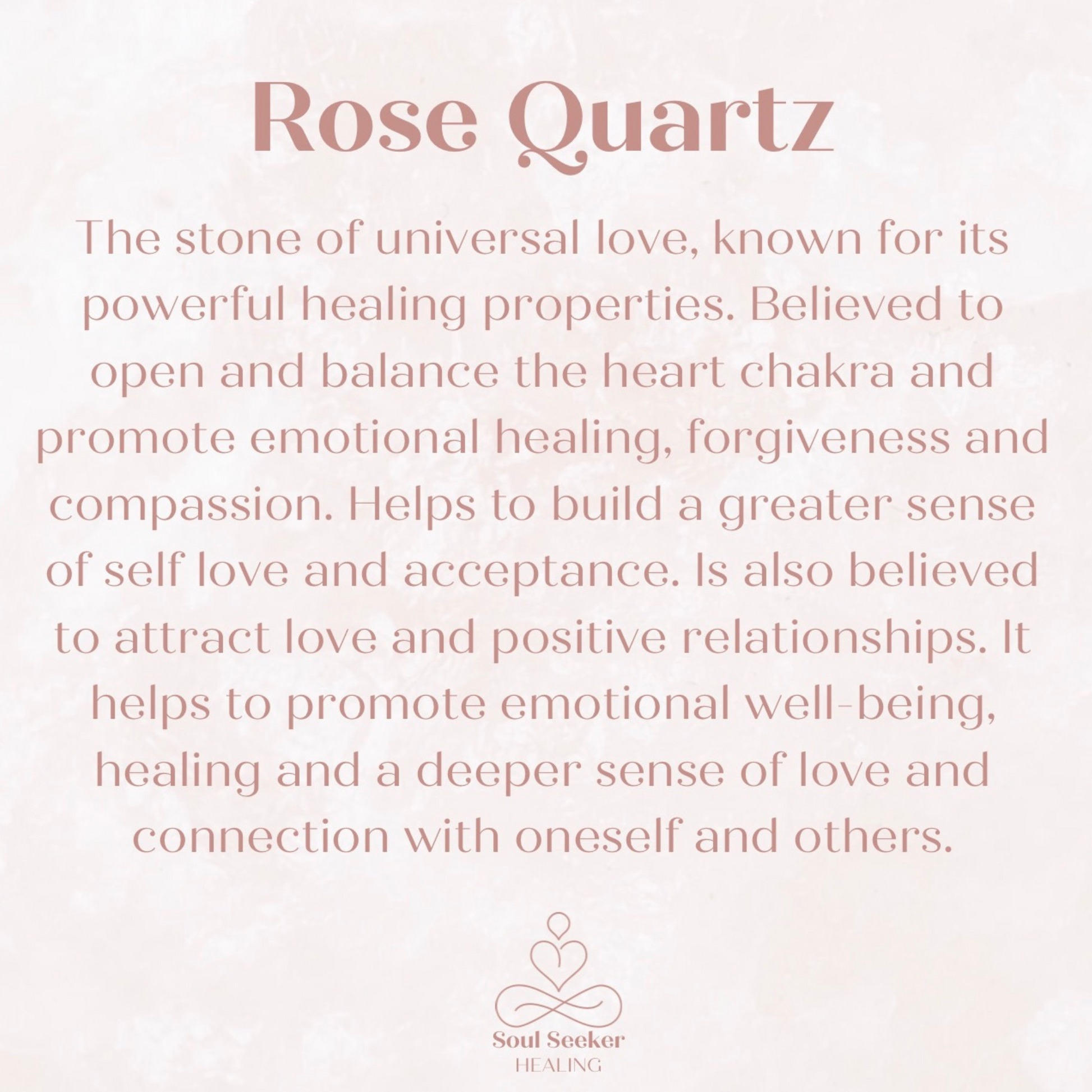 Rose quartz is the stone of universal love, known for its powerful healing properties. Believed to open and balance the heart chakra and promote emotional healing, forgiveness and compassion. Helps to build a greater sense of self love and acceptance. Is also believed to attract love and positive relationships. It helps to promote emotional well-being, healing and a deeper sense of love and connection with oneself and others.