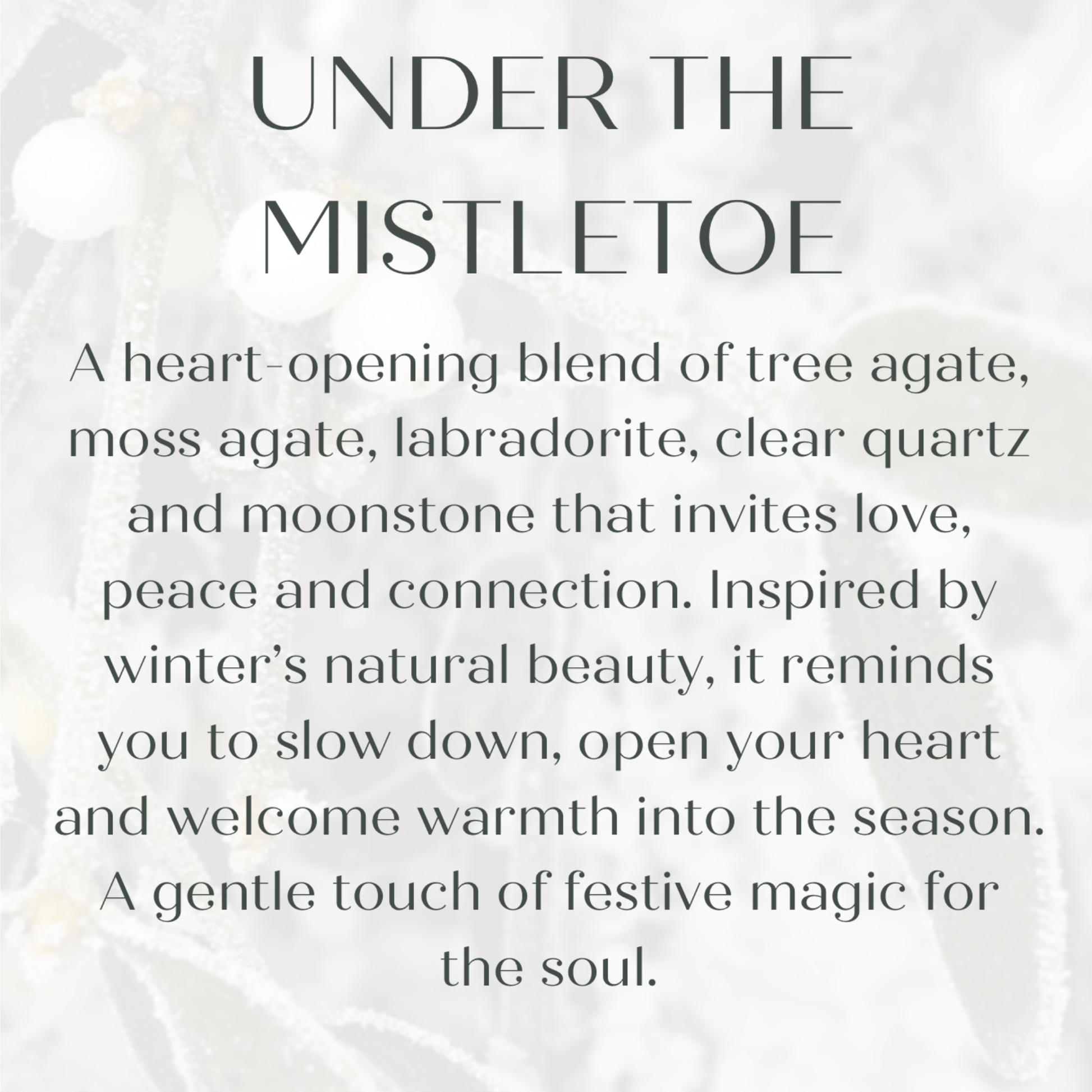 A heart-opening blend of tree agate, moss agate, labradorite, clear quartz and moonstone that invites love, peace and gentle connection. Designed to bring warmth and balance during the winter months, it’s a subtle reminder to open your heart and let a little magic in.
