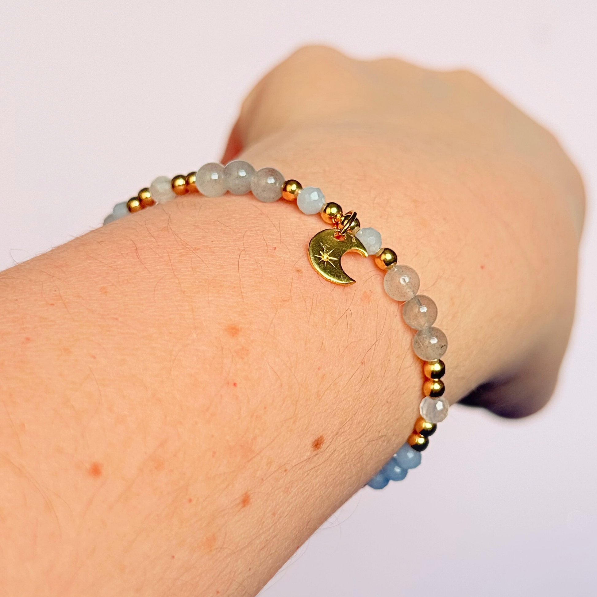 A soothing mix of labradorite, moonstone and angelite that mirrors the moon’s calm and intuitive energy. It helps you slow down, release tension and reconnect with your emotions. A peaceful reminder to trust your inner rhythm and flow.