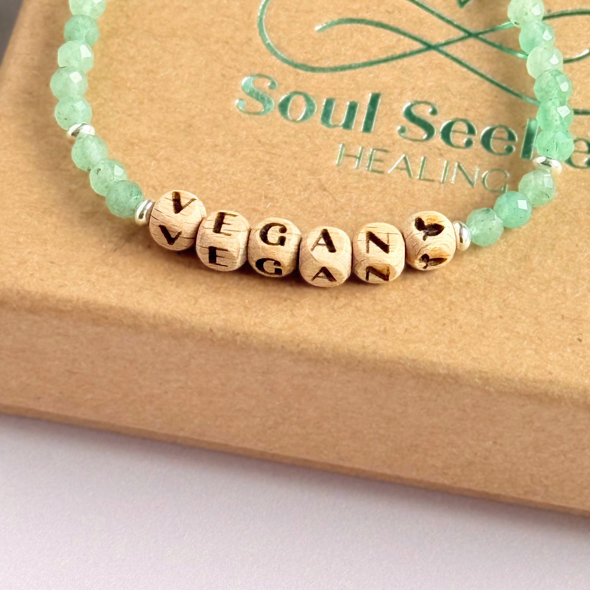 This green aventurine bracelet features our own unique engraved 5mm cubed wooden letter beads, spelling out the word ‘VEGAN’ with a leaf symbol.